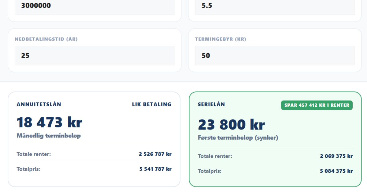 Bruk vår boliglånskalkulator for å se forskjellen på annuitetslån og serielån, og finn ut hvordan du kan spare hundretusener i renter på boliglånet ditt i 2026.