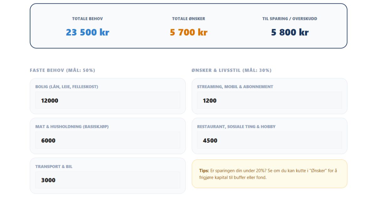 Lær hvordan du bruker vår budsjettkalkulator for å analysere din personlige økonomi, identifisere lekkasjer og optimalisere din sparing etter 50-30-20-regelen.