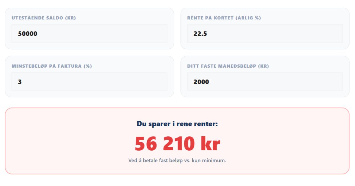 Lær hvordan minstebeløpet på kredittkortet fungerer som en gjeldsfelle, og bruk vår kalkulator for å se hvor mye du sparer på raskere nedbetaling.